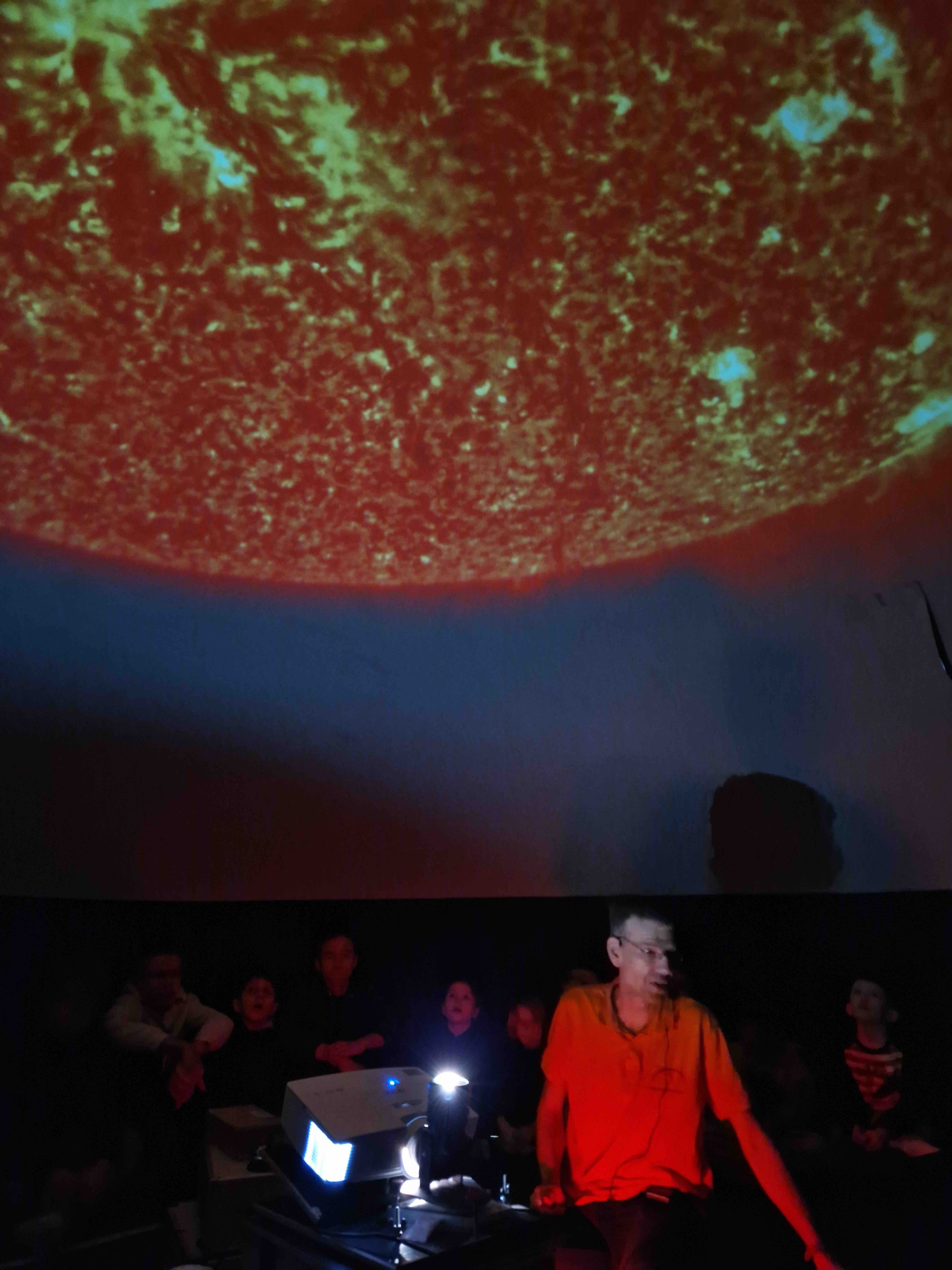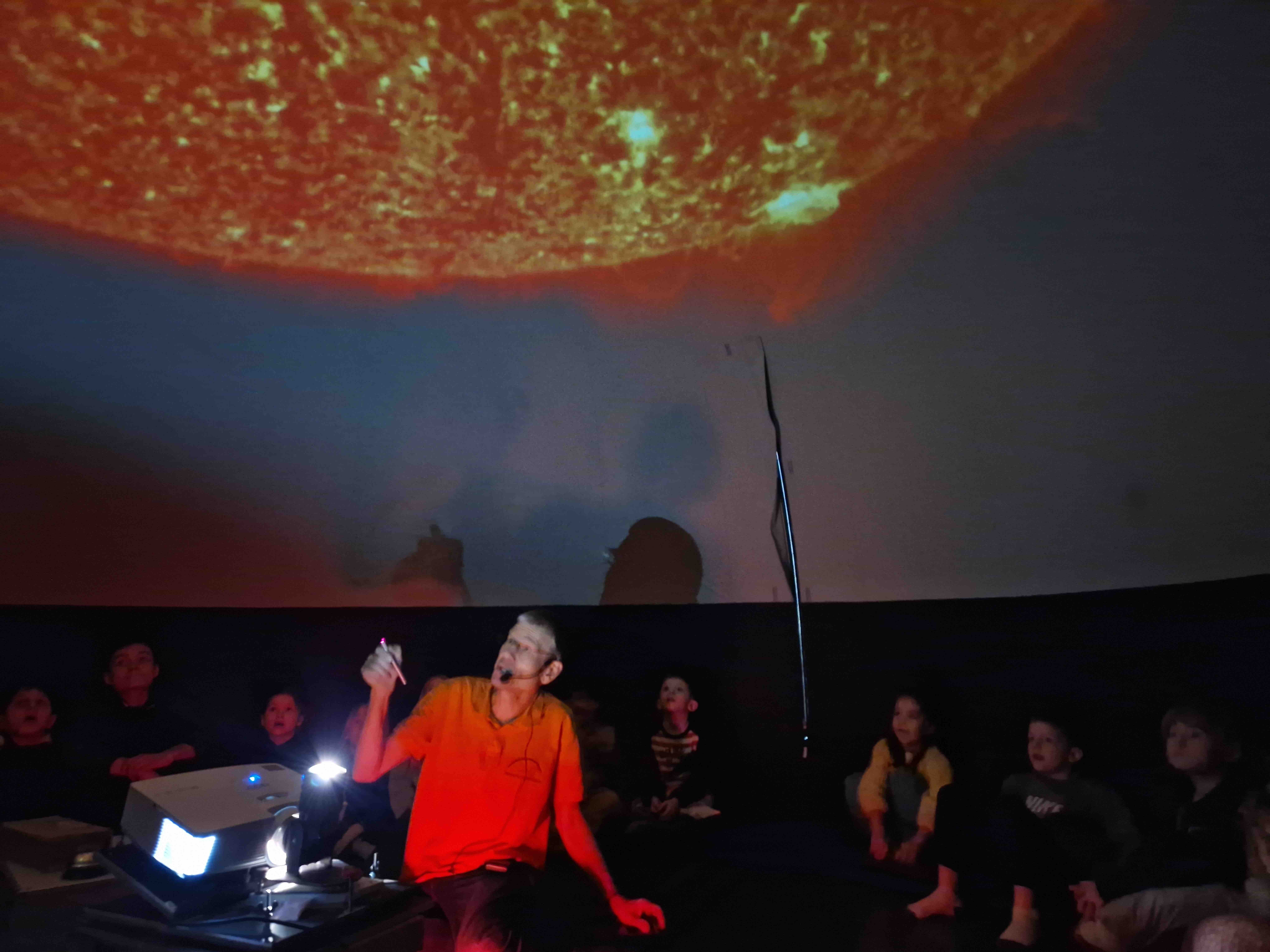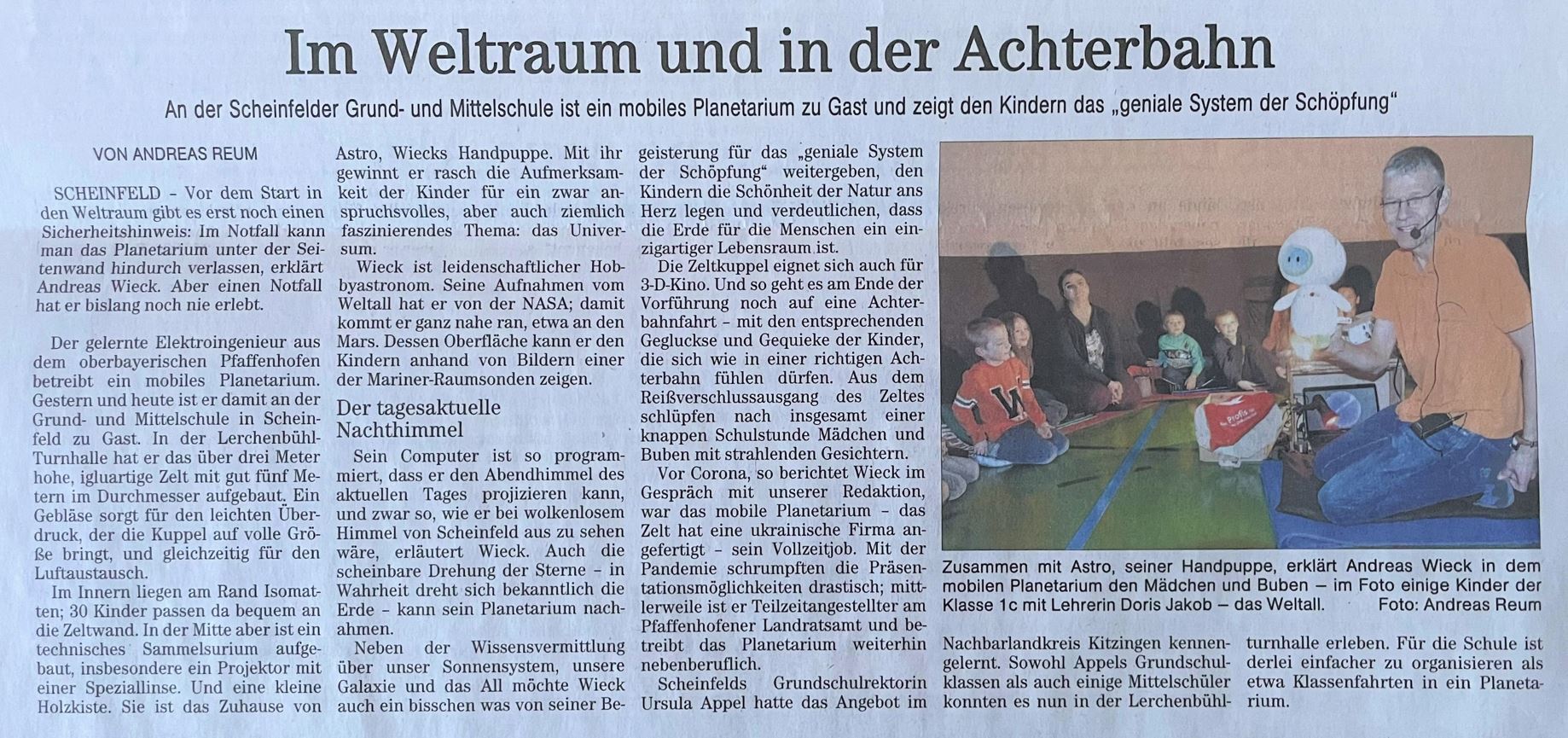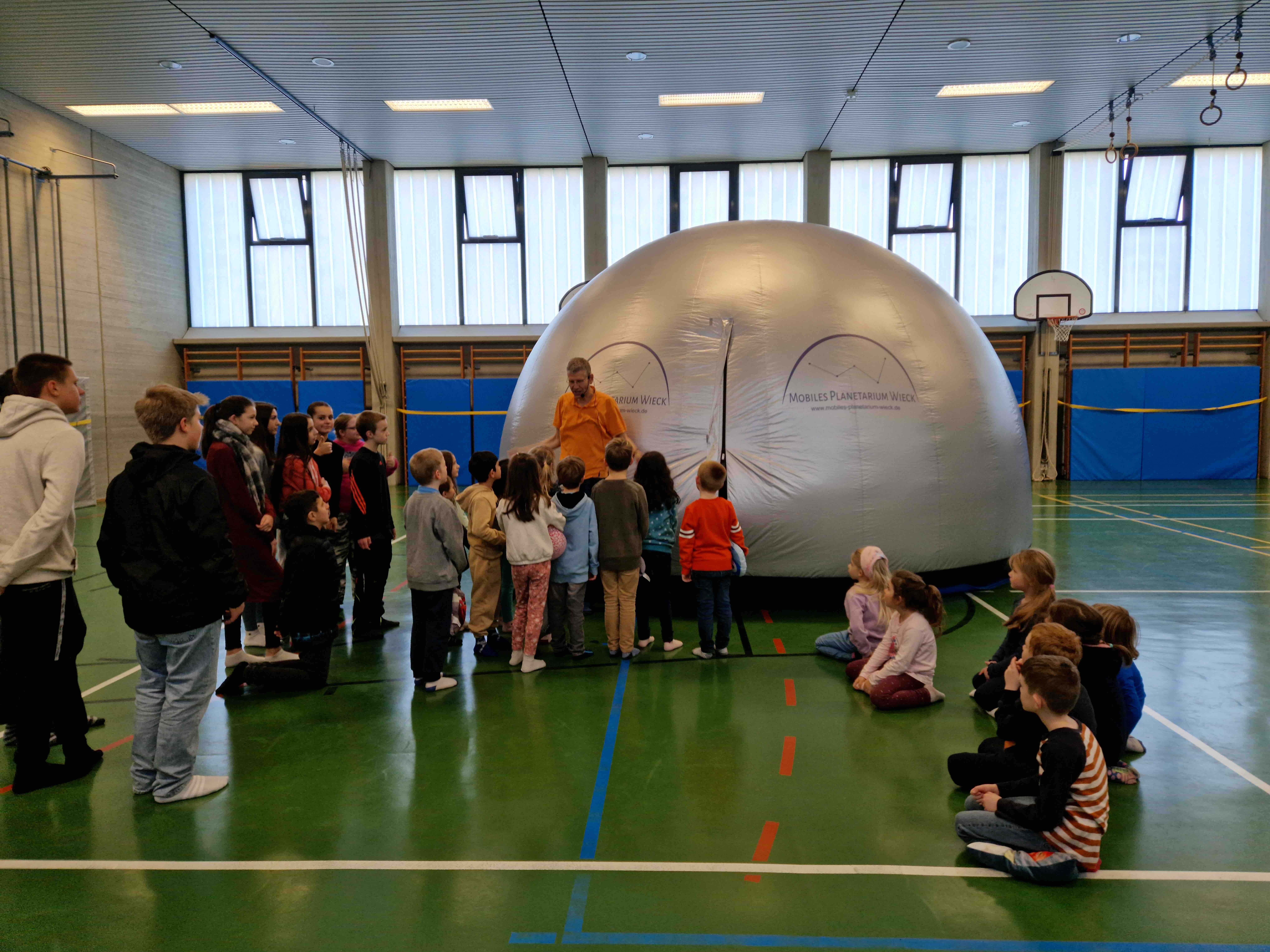Am 17. und 18. Januar 2023 besuchte Herr Andreas Wieck die GS Scheinfeld. Herr Wieck, ein begeisterter Sternenforscher, Hobby-Astronom und gelernter Elektroingenieur aus Oberbayern, hatte im Gepäck seines Fahrzeuges in mehreren großen und kleinen Taschen eine ganz besondere Faszination für unsere Grundschüler mitgebracht. In kürzester Zeit baute Herr Wieck in der Schulturnhalle ein kuppelförmiges Zelt auf und bereitete mit allerlei technischen Geräten ein mobiles Planetarium für die Schülerinnen und Schüler vor. Kurz nach Schulbeginn stand auch schon die erste Schulklasse gespannt und voller Vorfreude vor dem imposanten Zeltaufbau und machte es sich unter Anleitung von Herrn Wieck im Inneren des mobilen Planetariums bequem. Sofort begann Herr Wieck von seiner Begeisterung für den Sternenhimmel zu erzählen, erklärte die Besonderheiten von Sternen und führte die Kinder mit eindrucksvollen 3-D-Projektionen durch unser Planetensystem. Er zeigte Bilder der Sonne und des Mars und ließ die Kinder Sternenbilder am aktuellen Nachthimmel entdecken. Diese kurzweilige Schulstunde endete mit einer atemberaubenden Achterbahnfahrt im 3-D-Kino und entlockte den Grundschülern lautstarke Begeisterungsausrufe. Neben den 11 Grundschulklassen besuchten auch die 5. und 6. Klassen der Mittelschule das mobile Planetarium und tauchten für eine Schulstunde ein in ein galaktisches Abenteuer, bei dem aber auch die Wissensvermittlung nicht zu kurz kam.