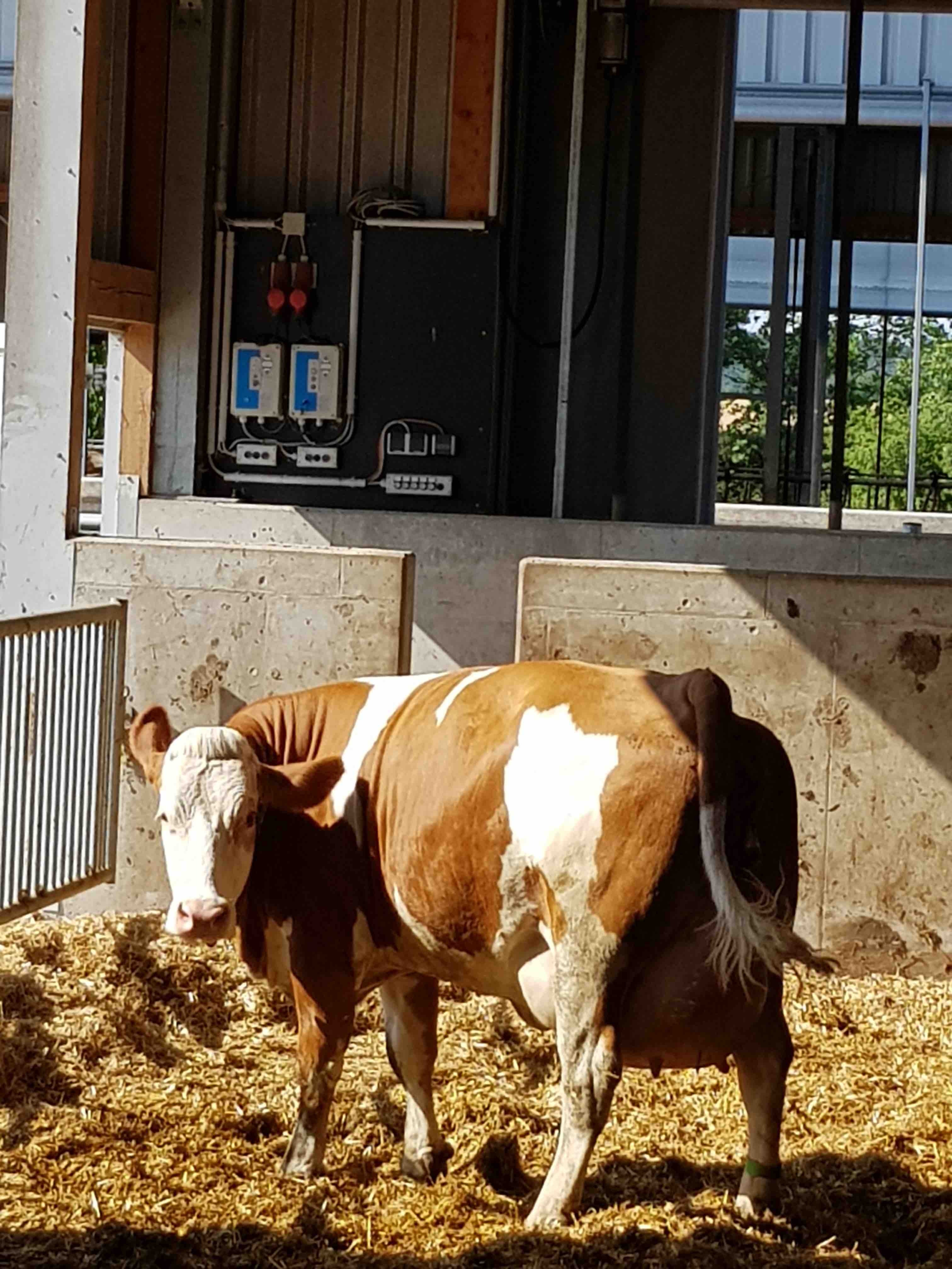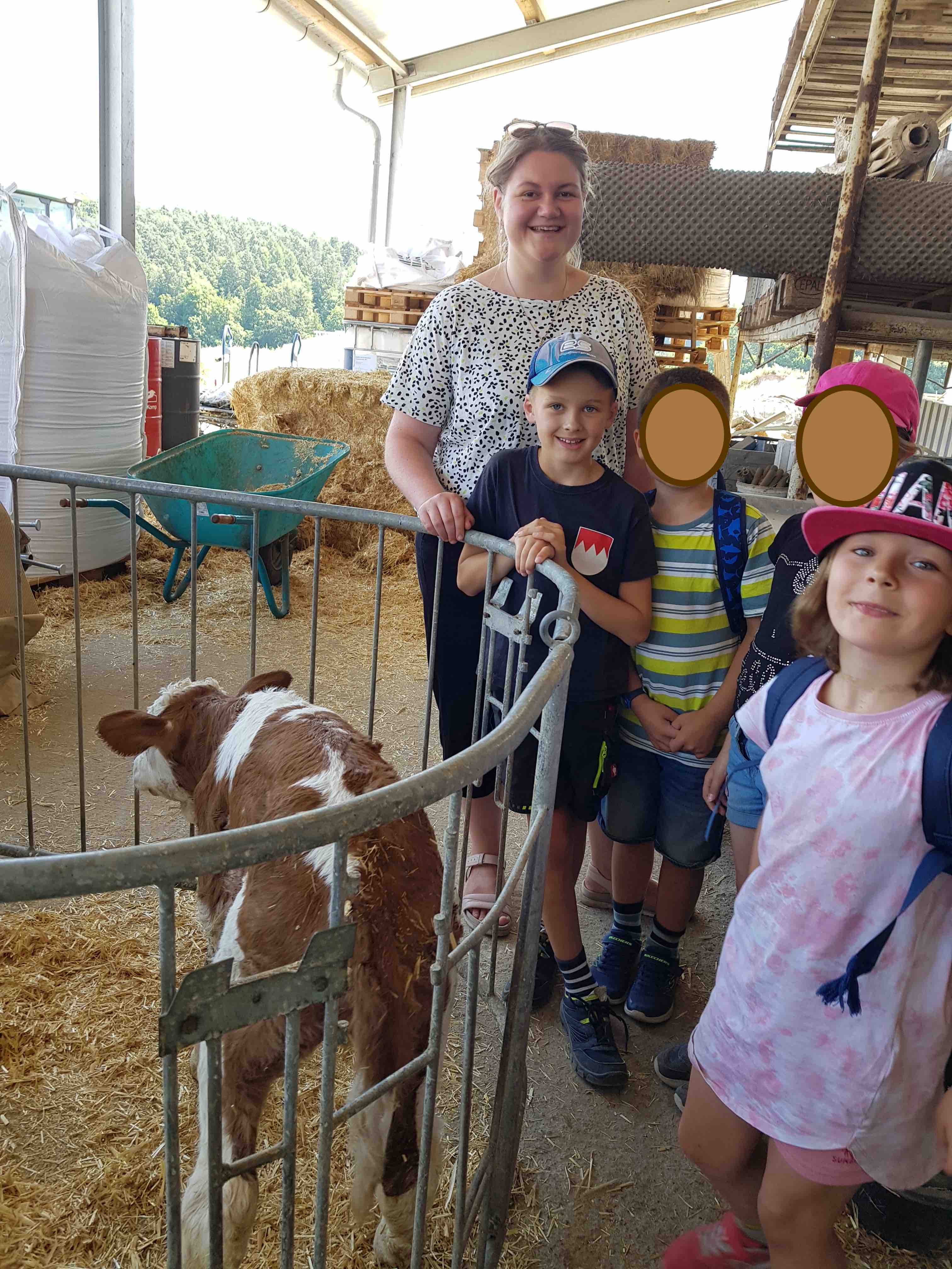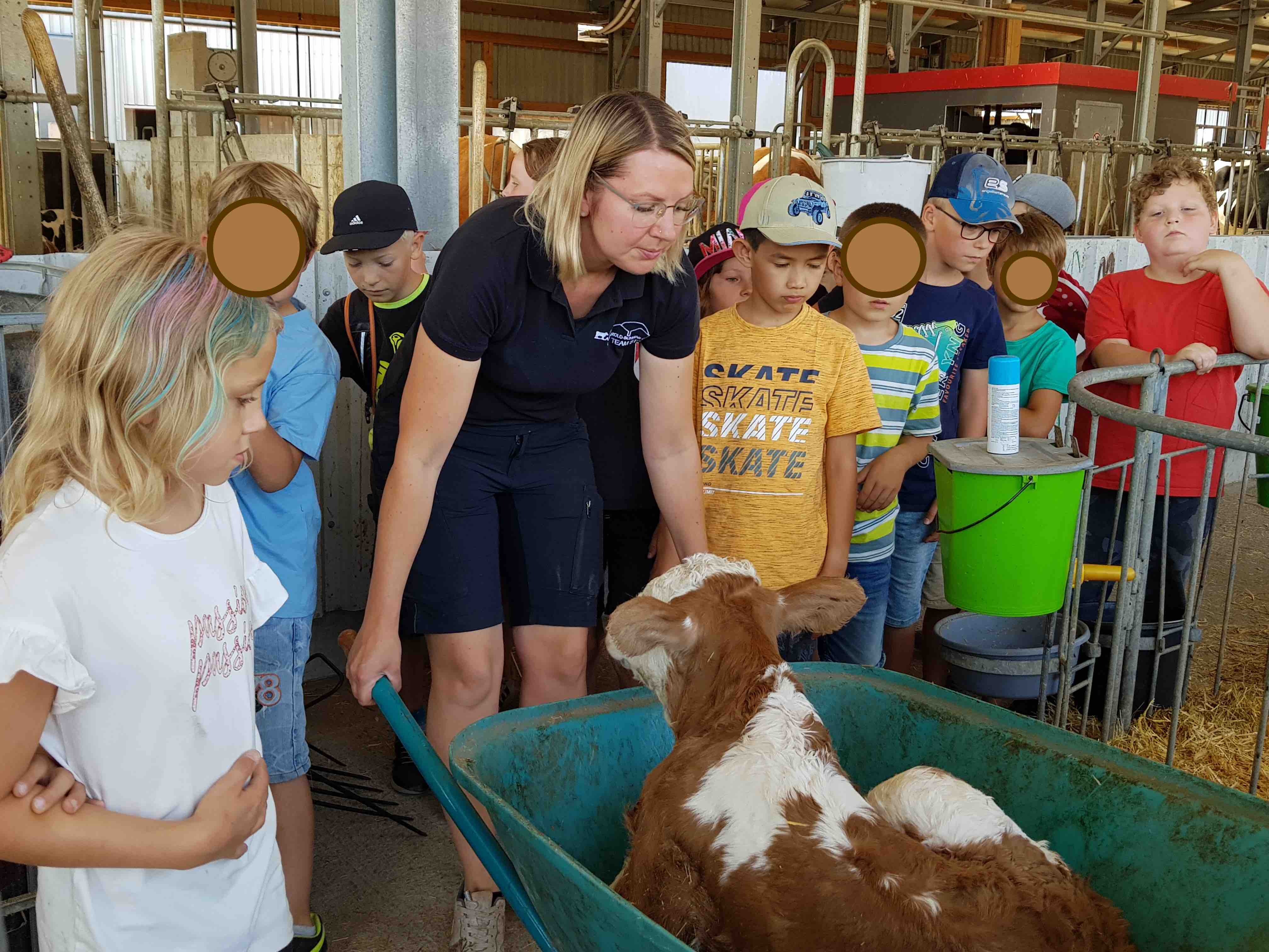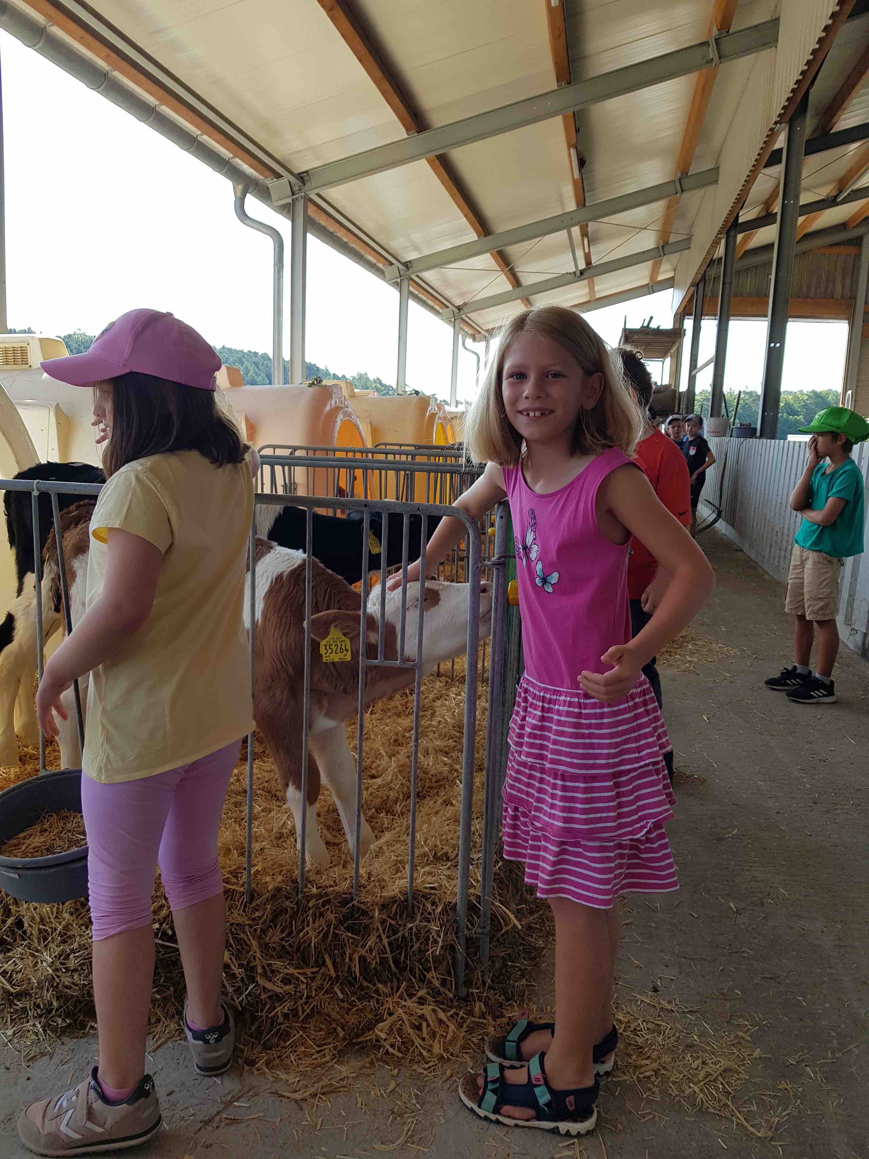 Kaum angekommen wurden sie von Familie Schwab herzlich empfangen. Die Eltern einer Schülerin der 2c führte die aufgeregte Kinderschar durch den Hof und zeigte ihnen Katzen, Hasen und v.a. Kühe. Besonders beeindruckt waren die Kinder vom Melkroboter. Fasziniert beobachteten sie, wie die Kühe sich ganz von alleine zum Melken begaben. Auch die automatische Kälbertränke erregte ihre Neugier. Die Kinder waren begeistert davon, wie die kleinen Kälber selbstständig ihre Milchportionen abholten.