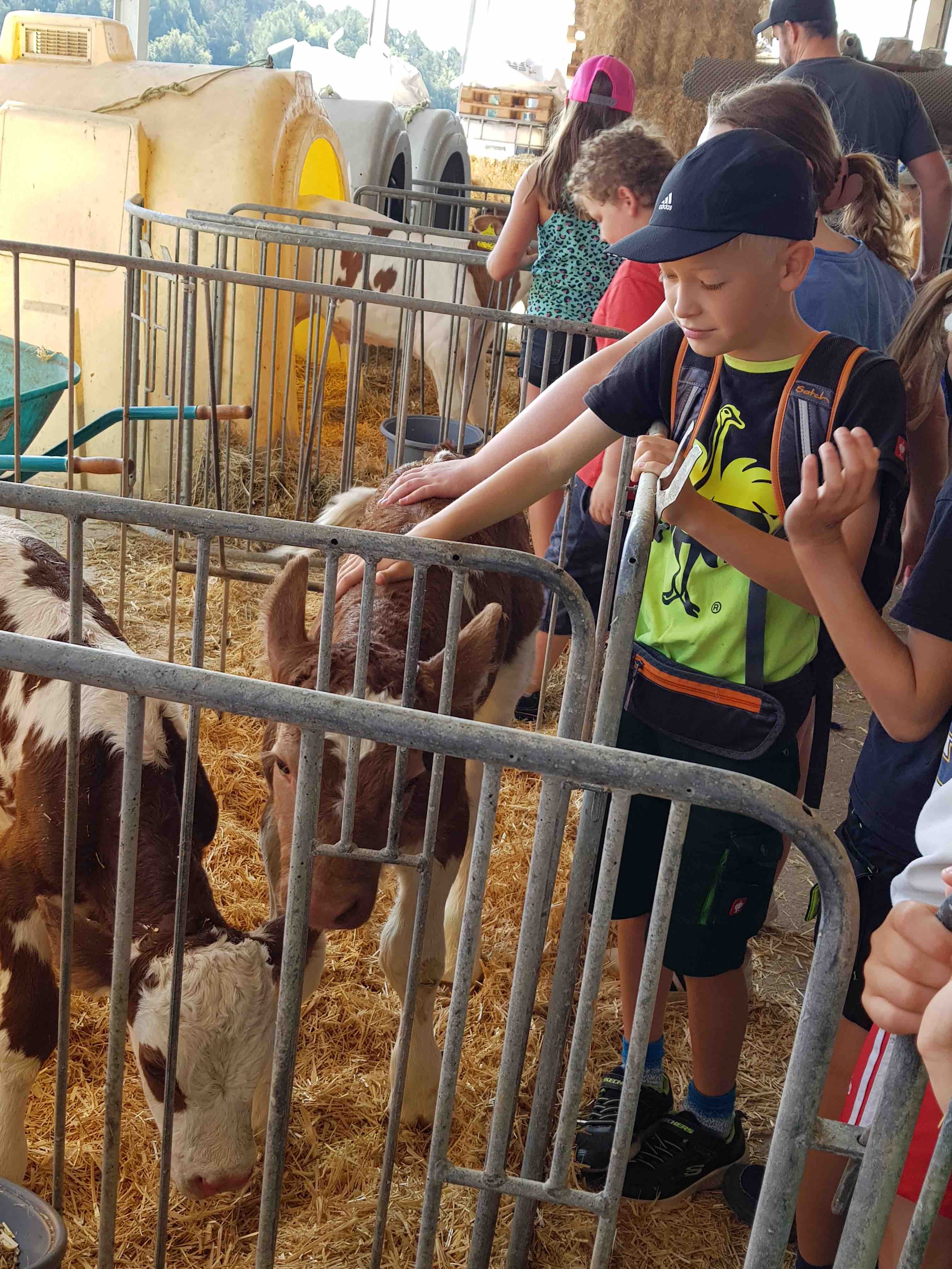 Später begleitete die Klasse das niedliche Kälbchen zu seinem neuen Stall und konnte es kaum erwarten, Henry Schwab zu streicheln.