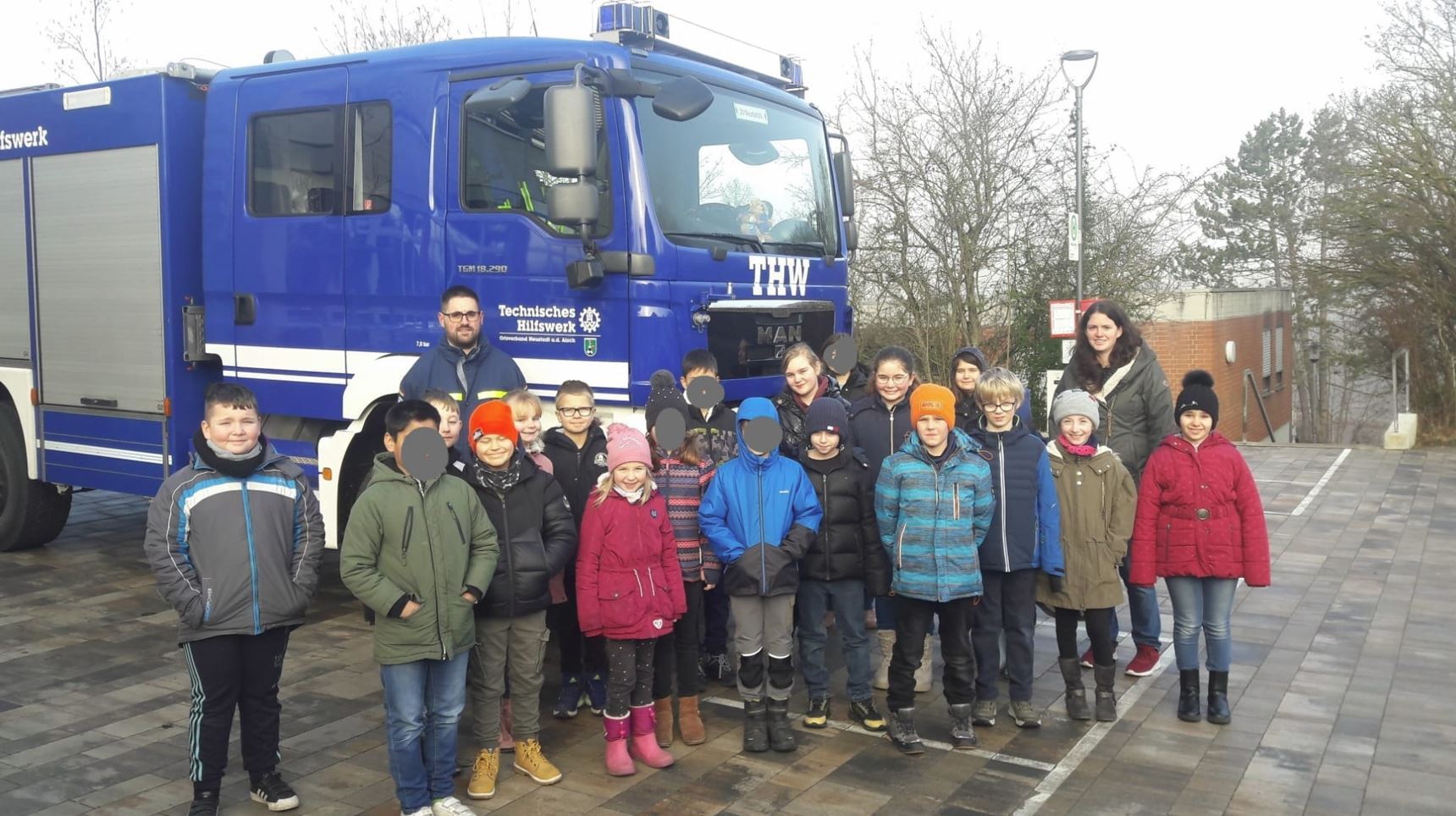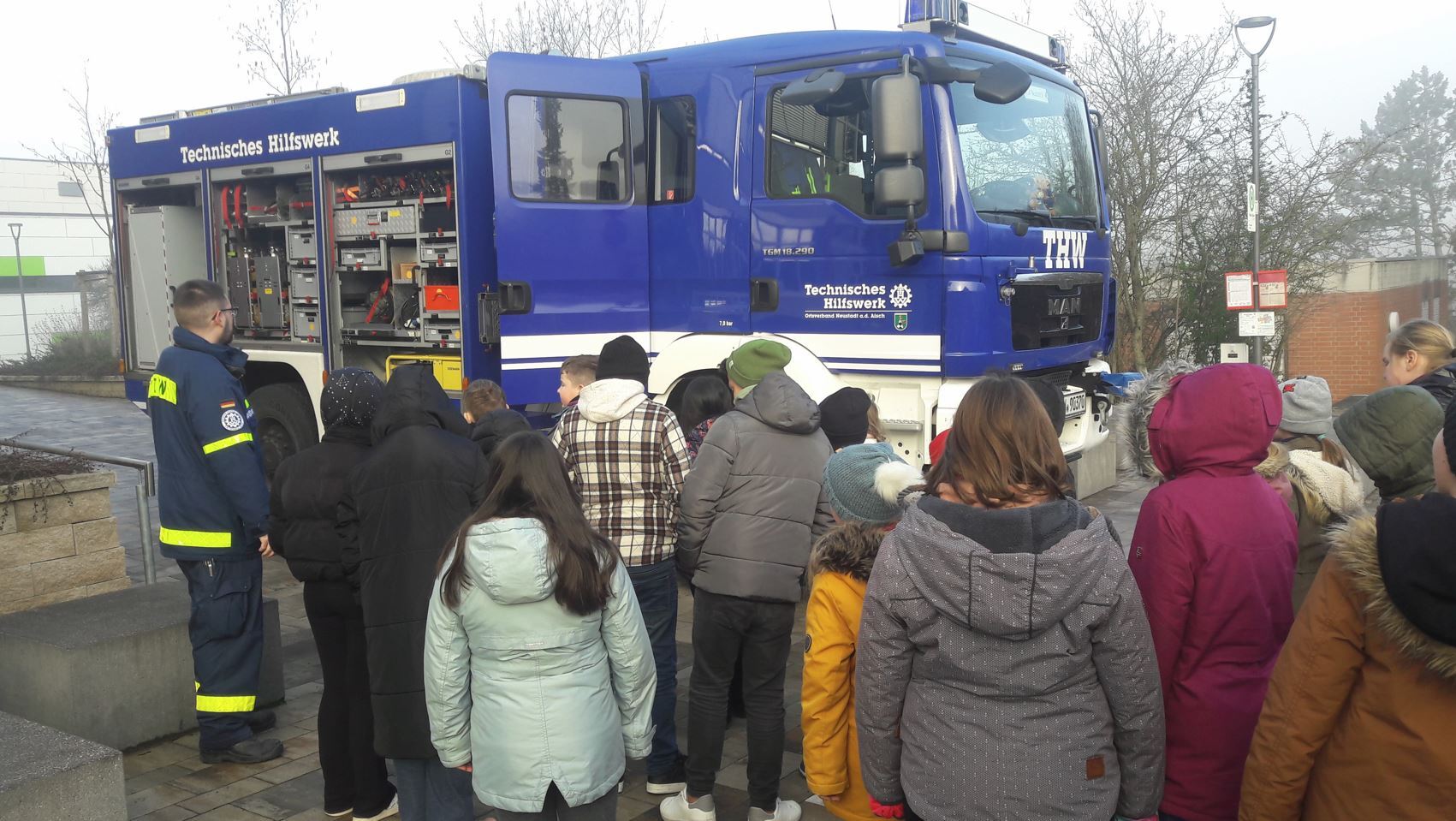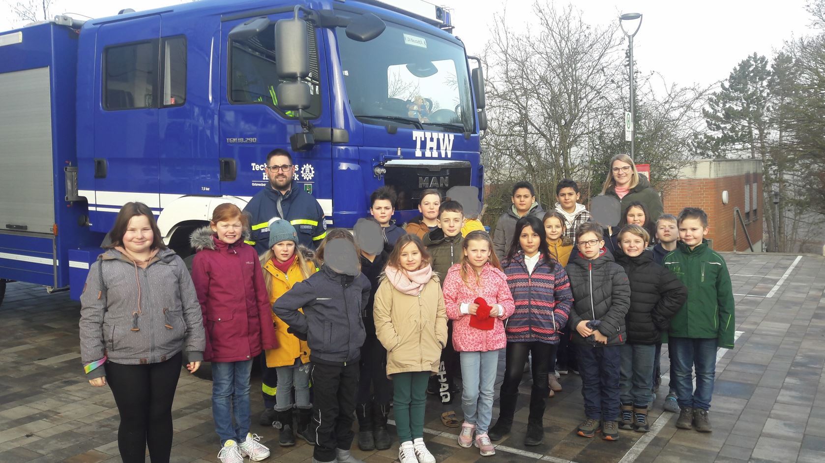 Neben der Feuerwehr lernten die Feuerforscher auch das THW (Technisches Hilfswerk) im Unterricht kennen. So erfuhren sie, dass das THW der Feuerwehr bei großen Bränden beim Löschen hilft. Mit seinen vielen Baggern und Kränen kann das THW der Feuerwehr zur Seite stehen, indem sie Glutnester aufdecken. Als Experten luden die Klassen 3b und 3c den stellvertretenden Ortsbeauftragten des THW in Neustadt Thomas Scherzer in den Unterricht ein. Er erklärte den Kindern mit vielen Bildern die Aufgaben des THW, das zum Beispiel auch bei Hochwasser oder Erdbeben den Menschen hilft. Auch brachte Herr Scherzer seine Ausrüstung mit in das Klassenzimmer. Das große Highlight war für die Kinder der große blaue THW-LKW, der vor der Schule geparkt war. Dabei staunten die Drittklässler über die vielen Dinge, die in den LKW so rein passten. So zeigte Herr Scherzer beispielsweise ein Notstromaggregat, eine Seilwinde, Leitern, Schläuche, Atemschutzmasken mit Gasflaschen, ein Luftkissen oder einen Spreizer. Zum Schluss durften sich alle Kinder der beiden Klassen in den großen blauen LKW setzen. Dabei strahlten alle.