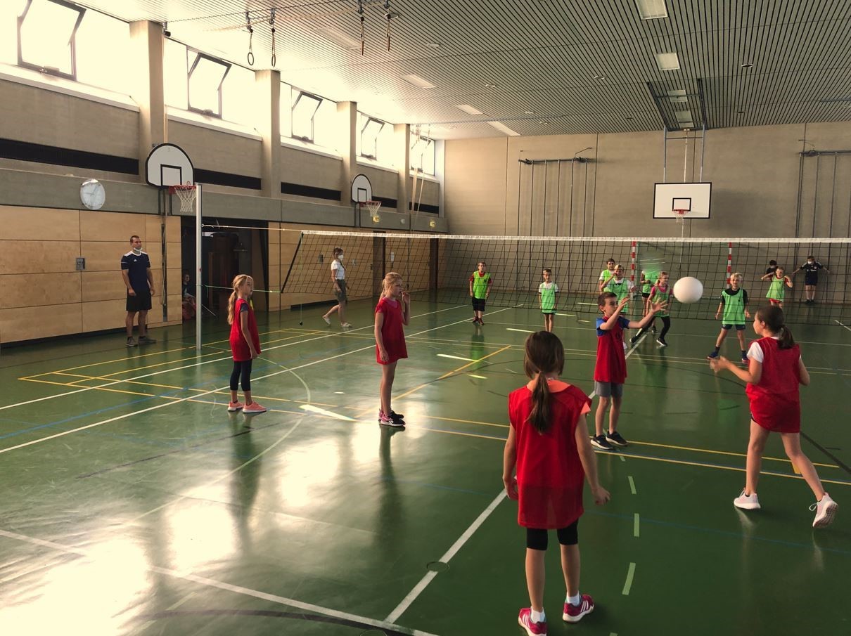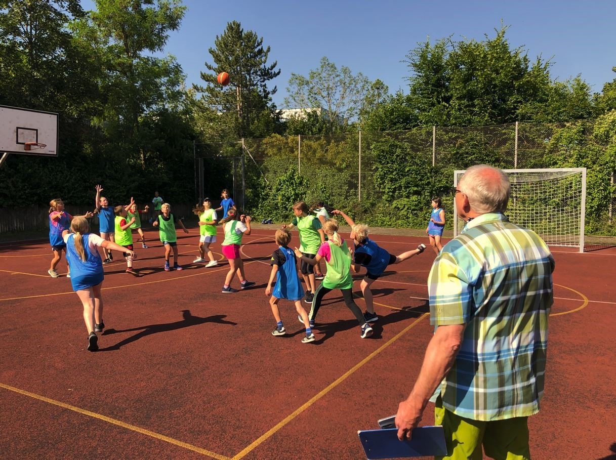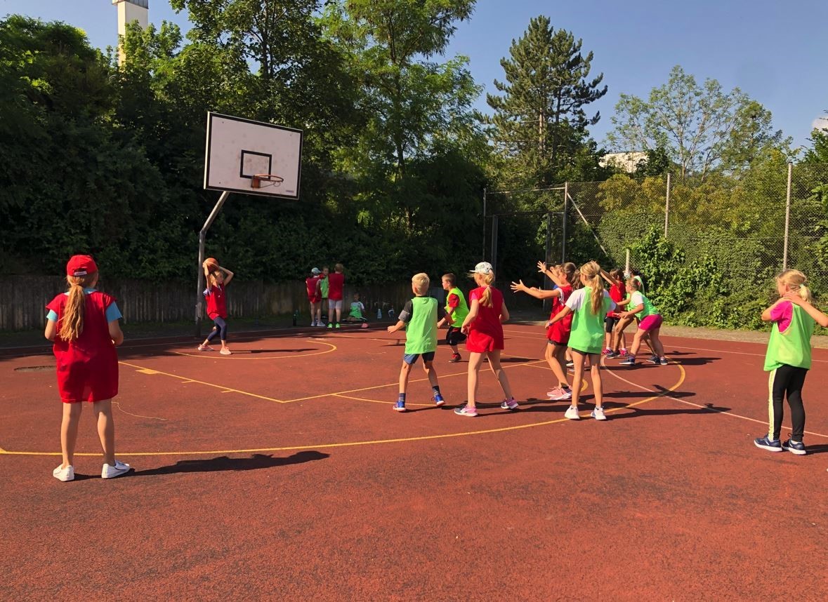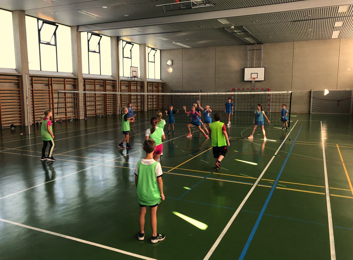 In Form eines Quattroturniers beteiligten sich die Kinder der Klassen 4a und 4b in vier Teams. Die ausgewählten Team-Namen ließen einiges erwarten: „Banana-Gang", „Fischi-Gang", „Die schnellen Blitze" und „Die wilden Wölfe" lauteten die Namen der vier Mannschaften. Gespielt wurde in einer Turnierform in den Sportarten Fußball, Korbball, Völkerball und Netzball.