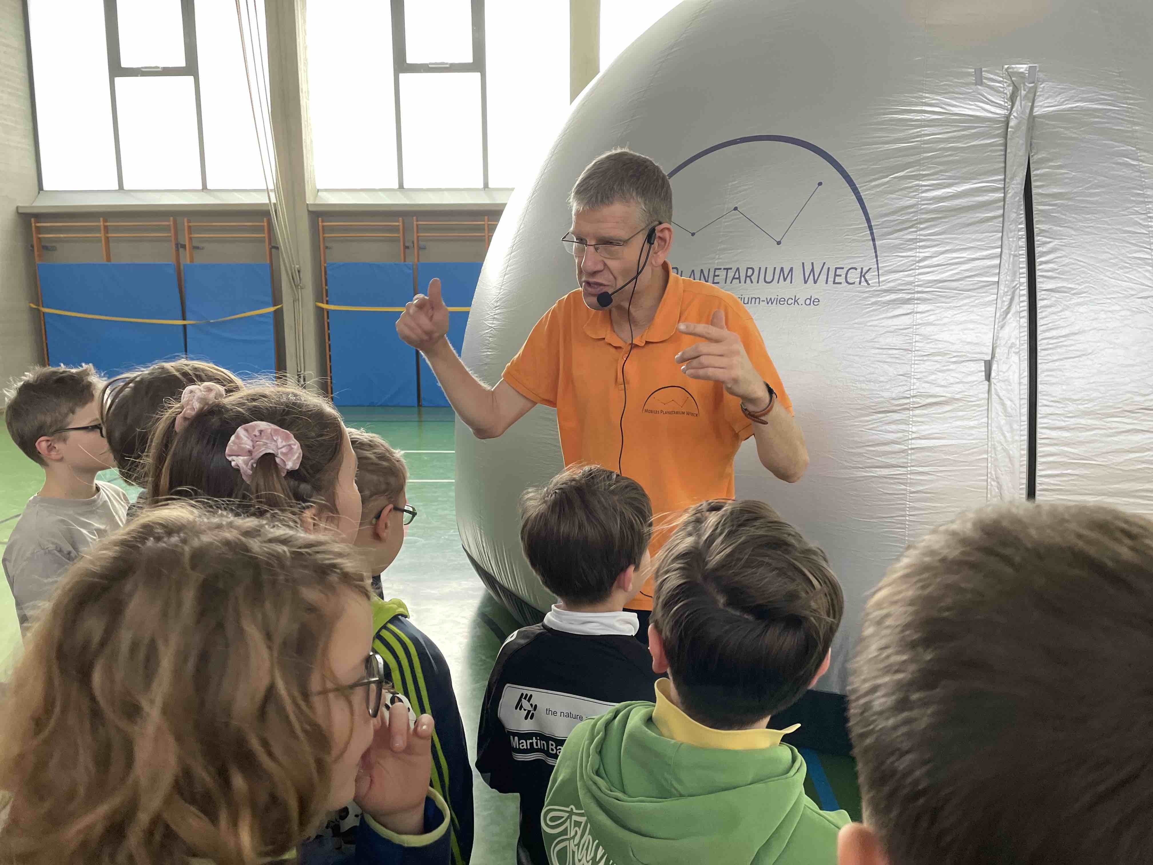 Am 17. und 18. Januar 2023 besuchte Herr Andreas Wieck die GS Scheinfeld. Herr Wieck, ein begeisterter Sternenforscher, Hobby-Astronom und gelernter Elektroingenieur aus Oberbayern, hatte im Gepäck seines Fahrzeuges in mehreren großen und kleinen Taschen eine ganz besondere Faszination für unsere Grundschüler mitgebracht. In kürzester Zeit baute Herr Wieck in der Schulturnhalle ein kuppelförmiges Zelt auf und bereitete mit allerlei technischen Geräten ein mobiles Planetarium für die Schülerinnen und Schüler vor. Kurz nach Schulbeginn stand auch schon die erste Schulklasse gespannt und voller Vorfreude vor dem imposanten Zeltaufbau und machte es sich unter Anleitung von Herrn Wieck im Inneren des mobilen Planetariums bequem. Sofort begann Herr Wieck von seiner Begeisterung für den Sternenhimmel zu erzählen, erklärte die Besonderheiten von Sternen und führte die Kinder mit eindrucksvollen 3-D-Projektionen durch unser Planetensystem. Er zeigte Bilder der Sonne und des Mars und ließ die Kinder Sternenbilder am aktuellen Nachthimmel entdecken. Diese kurzweilige Schulstunde endete mit einer atemberaubenden Achterbahnfahrt im 3-D-Kino und entlockte den Grundschülern lautstarke Begeisterungsausrufe. Neben den 11 Grundschulklassen besuchten auch die 5. und 6. Klassen der Mittelschule das mobile Planetarium und tauchten für eine Schulstunde ein in ein galaktisches Abenteuer, bei dem aber auch die Wissensvermittlung nicht zu kurz kam.
