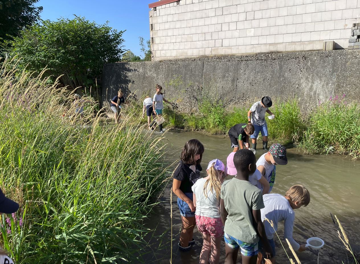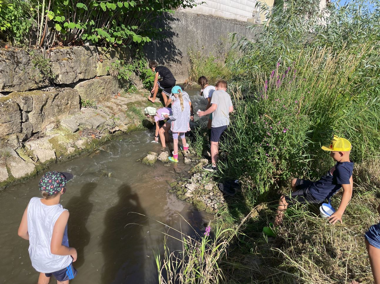 Jeweils klassenweise betreuten die Fischexperten zwei Aktionen im Wechsel. An der Scheine konnten die Kinder, ausgerüstet mit Keschern und Sieben, sogenannte Fischnährtiere, also Kleinstlebewesen wie Larven und Insekten aus der Scheine herausfischen. Mit Herrn Forsters fachkundlicher Hilfe bestimmten die Kinder Bachflohkrebse, Köcherfliegenlarven, Eintagsfliegenlarven und eine Reihe weiterer Kleinstlebewesen.